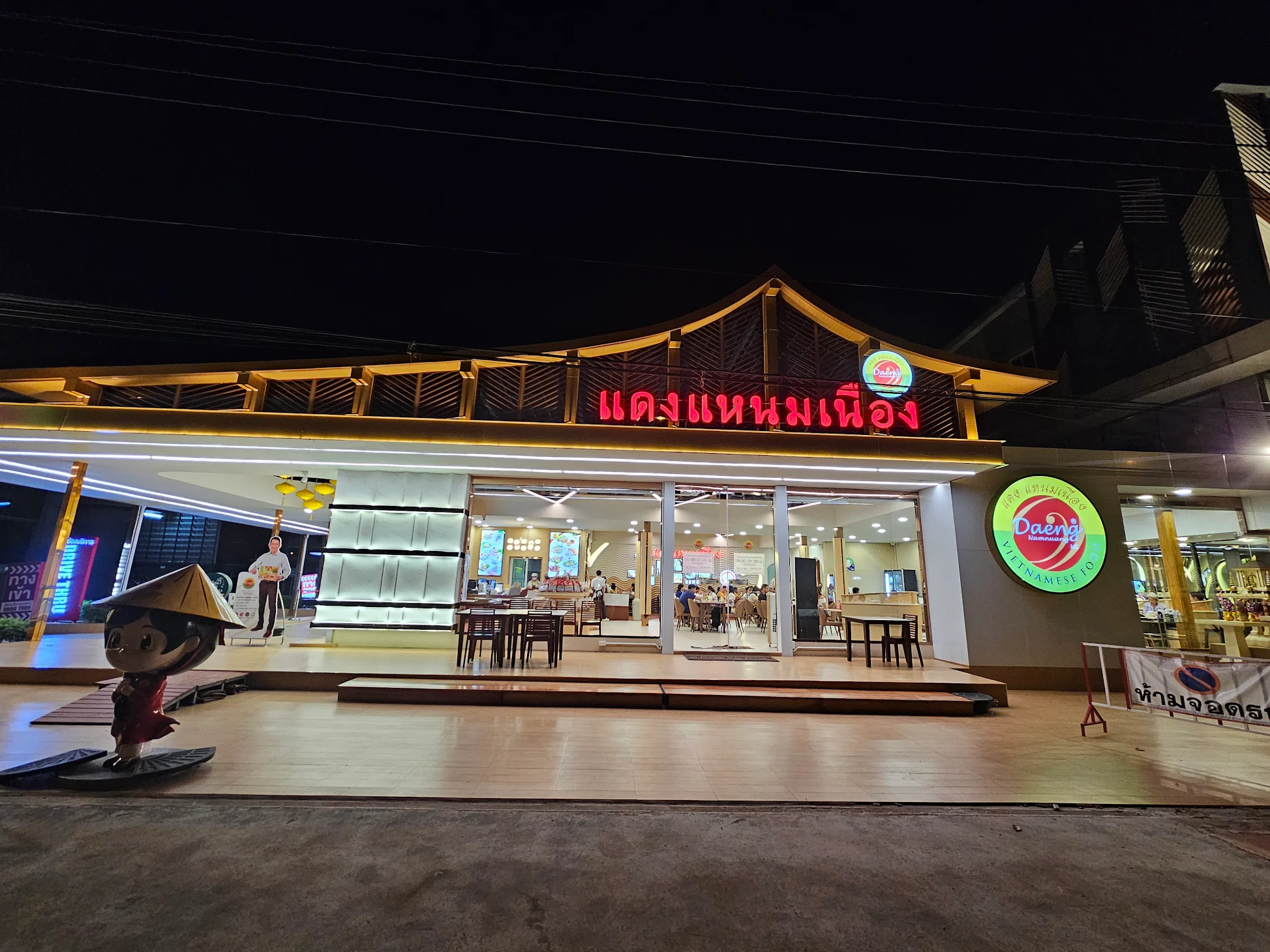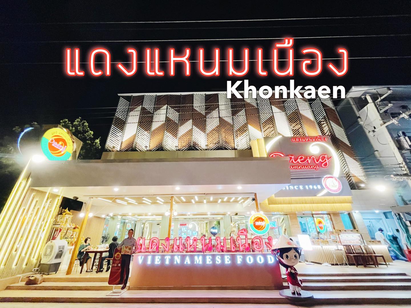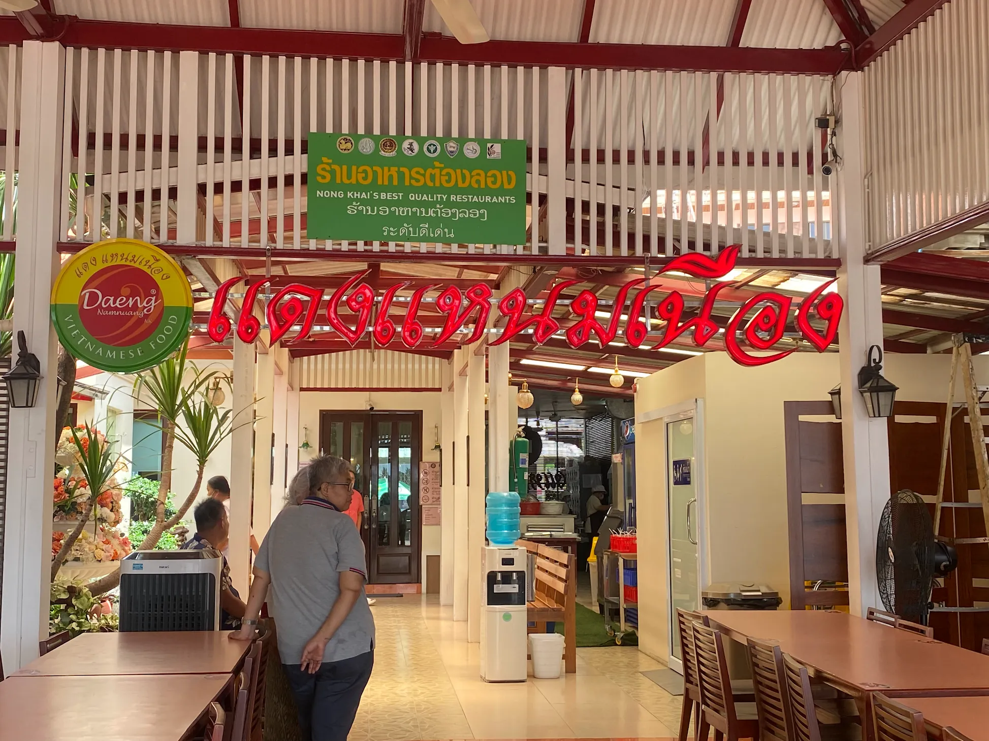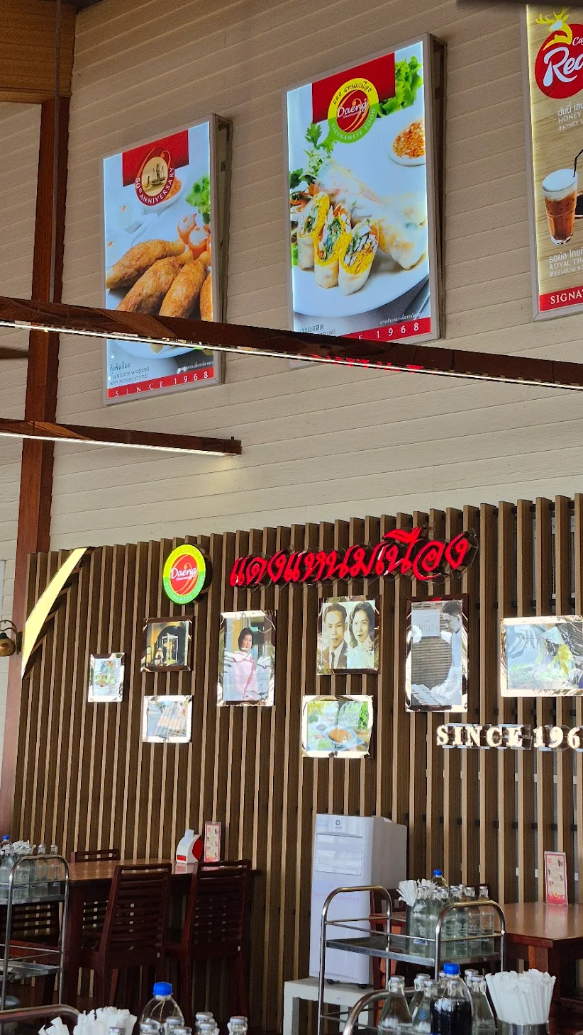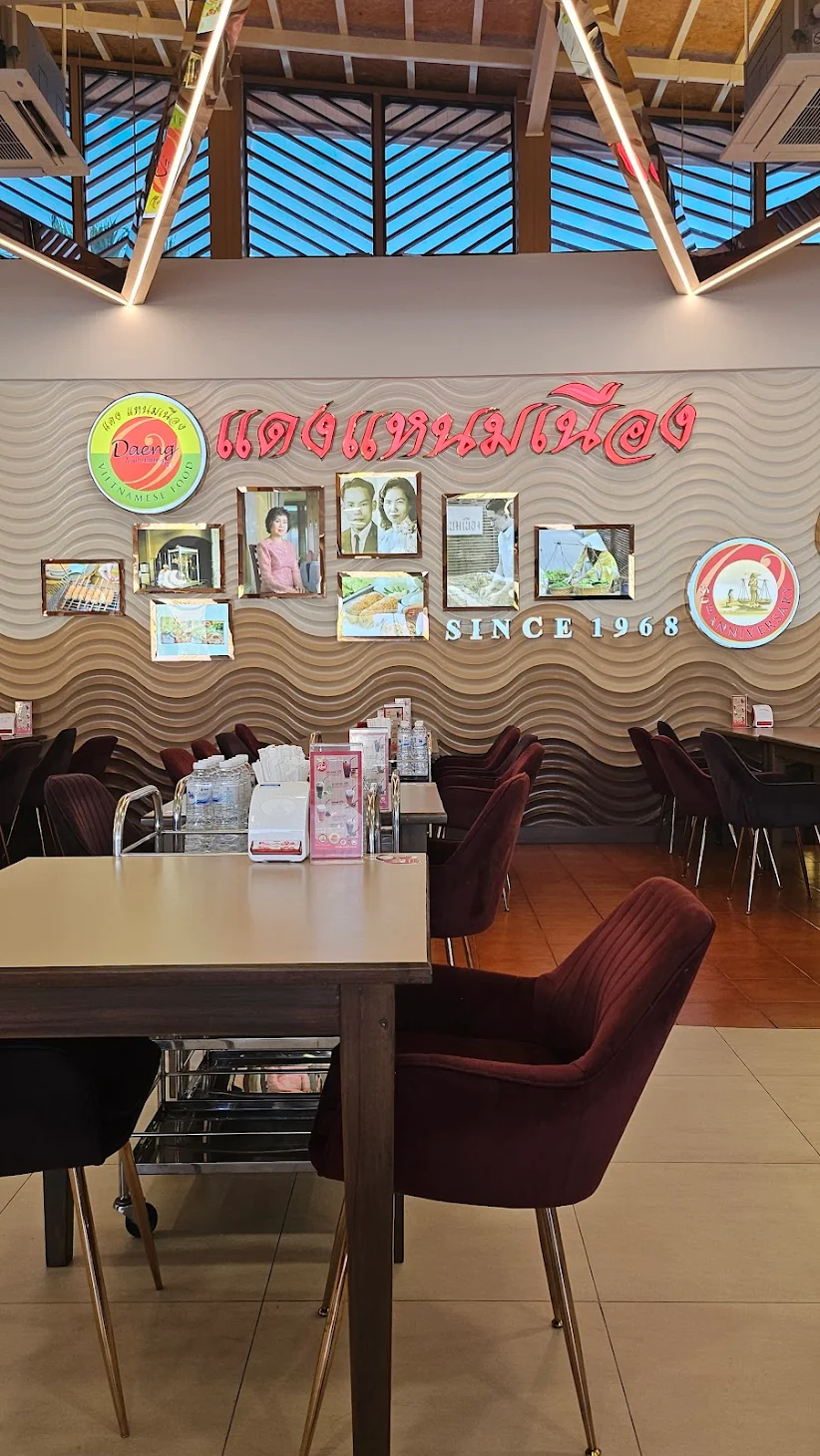 บรรยากาศอันร่มรื่น สวยงามของมนต์เสน่ห์แห่งลุ่มน้ำโขง... ที่ลูกค้าจะได้สัมผัสกับ ที่นั่งริมระเบียง ทอดยาวไปตามริมแม่น้ำโขง บรรยากาศสบายๆ เหมือนกับอยู่บ้าน ท่านจะได้ลิ้มรสแหนมเนือง และอาหารเวียดนามแสนอร่อย และบริการที่เป็นกันเอง พร้อมไปกับนั่งชมทัศนียภาพอันสวยงามของริมฝั่งโขง ที่ร้านแดงแหนมเนือง มีห้องปรับอากาศ ขนาดต่างๆ รองรับการจัดเลี้ยงเป็นหมู่คณะ และกรุ๊ปทัวร์ อีกทั้งยังมีห้องจัดเลี้ยงบรรยากาศส่วนตัว เพื่อรับรองแขกพิเศษในโอกาสต่างๆ อีกด้วย